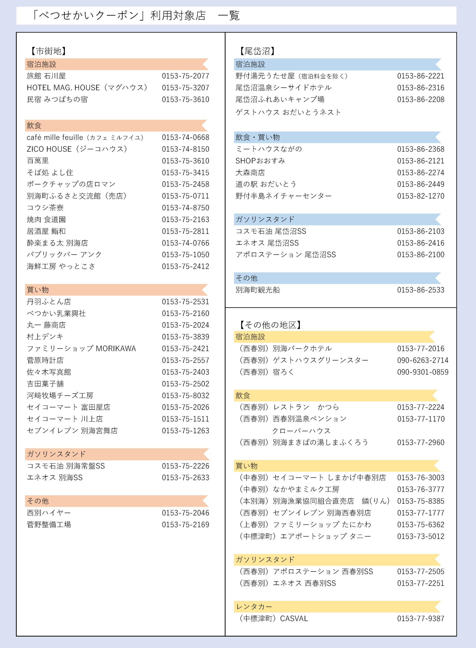 2025年8月15日(金)から開始した「べつせかいクーポン」の利用可能店舗の一覧です。