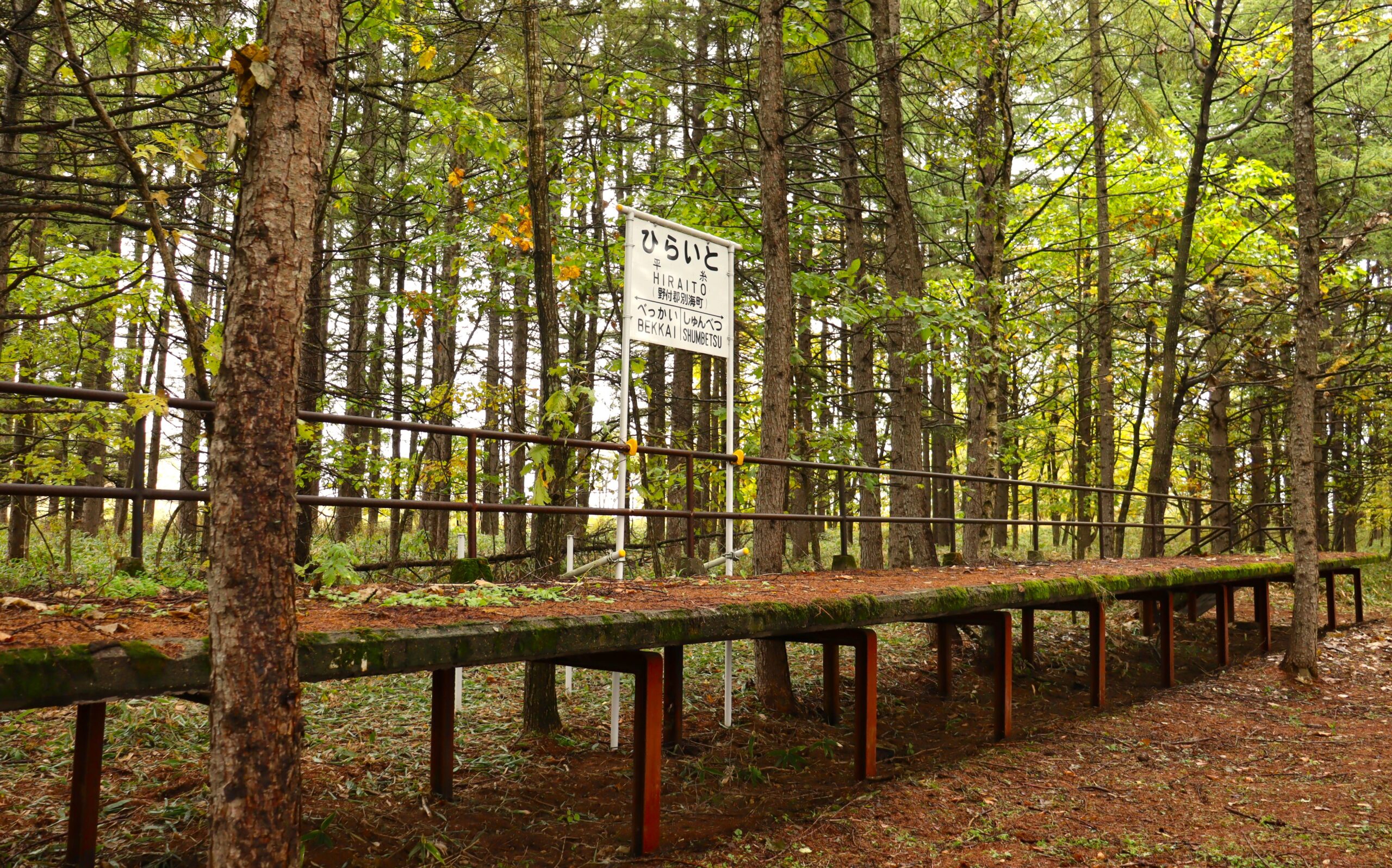 1989(平成元)年に廃止された標津線の駅跡地。別海市街地から中標津に向かって車を走らせると途中平糸というバス停があり、そこから横道に少し入ったところに旧平糸駅はあります。鬱蒼とした林の中に簡易ホームが残存していて、往年を偲ぶことができます。